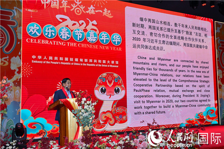 马珈在致辞中向全体旅缅同胞和缅甸各界致以新春问候和节日祝福,表示春节是中华民族最古老、最盛大、最重要的传统佳节,象征团结兴旺,体现中华文化和睦、和谐、和平的精神内核。2024年7月,缅甸政府将中国春节定为公共假日,显示了缅方对中缅友谊的高度重视。中国春节和缅甸泼水节均被列入联合国教科文组织人类非物质文化遗产名录,展示了民族文化符号对人类文明的重要作用。2025年是中缅建交75周年,乙巳蛇年也被称为“佛灯火年”,象征着生命、好运和新的开始。期待蛇年给中缅两国人民带来更多福祉,中缅友好合作再上层楼。