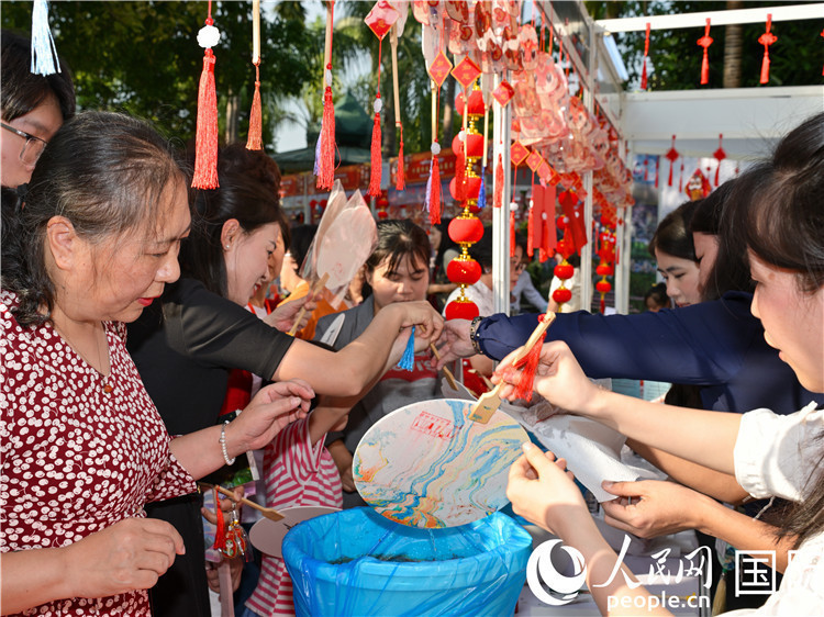 观众在“欢乐春节嘉年华”活动现场体验漆扇制作。人民网记者 谢佳君摄